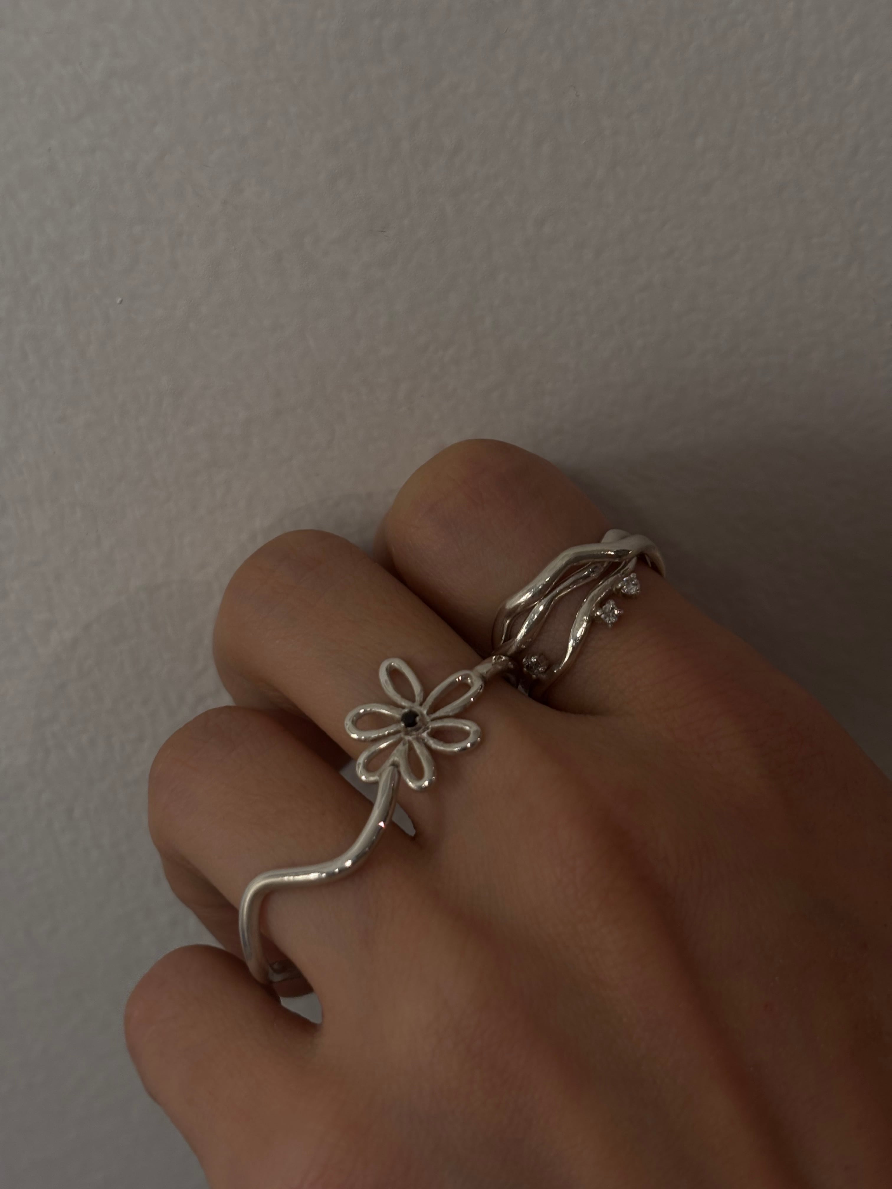 MOMOさんの花の筆致をリングに映し、リングアームには、彼女のサインをなぞるような流れる曲線を取り入れました。中指と薬指、または人差し指と中指、でも着用可能です。