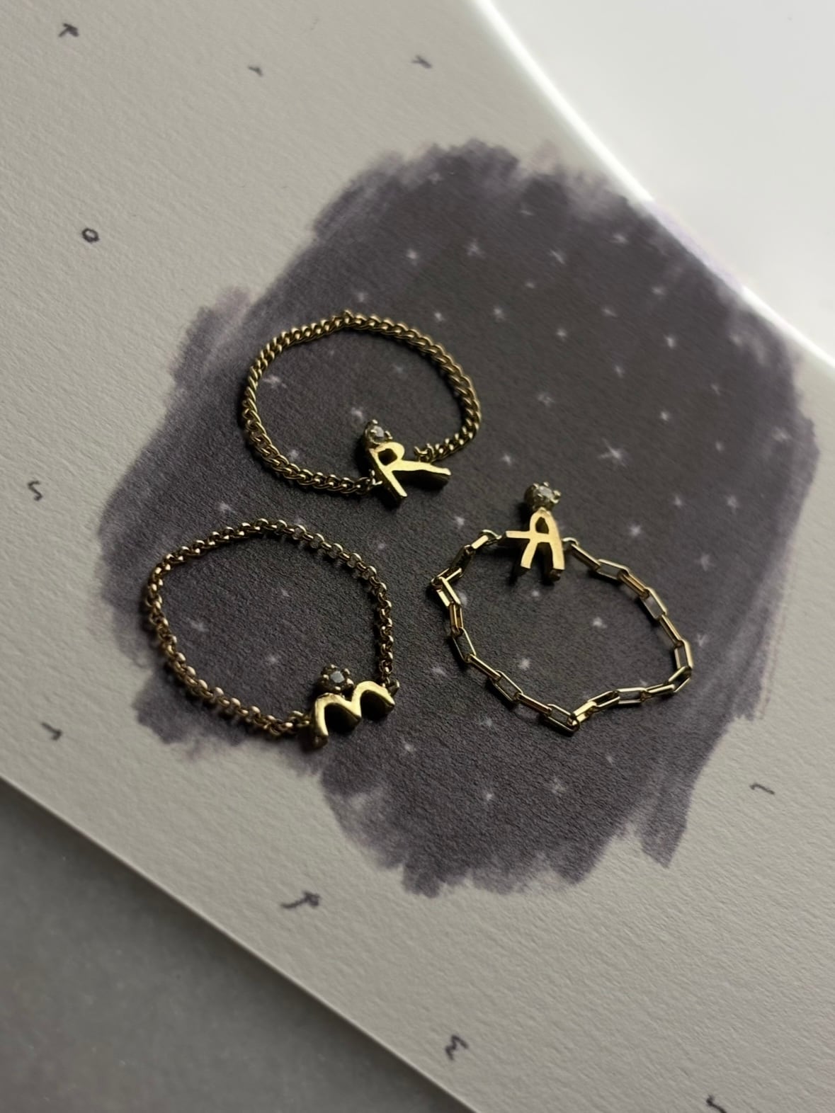 MOMO MOJIの小さなイニシャルに、きらりと光る王冠を添えたチェーンリング。