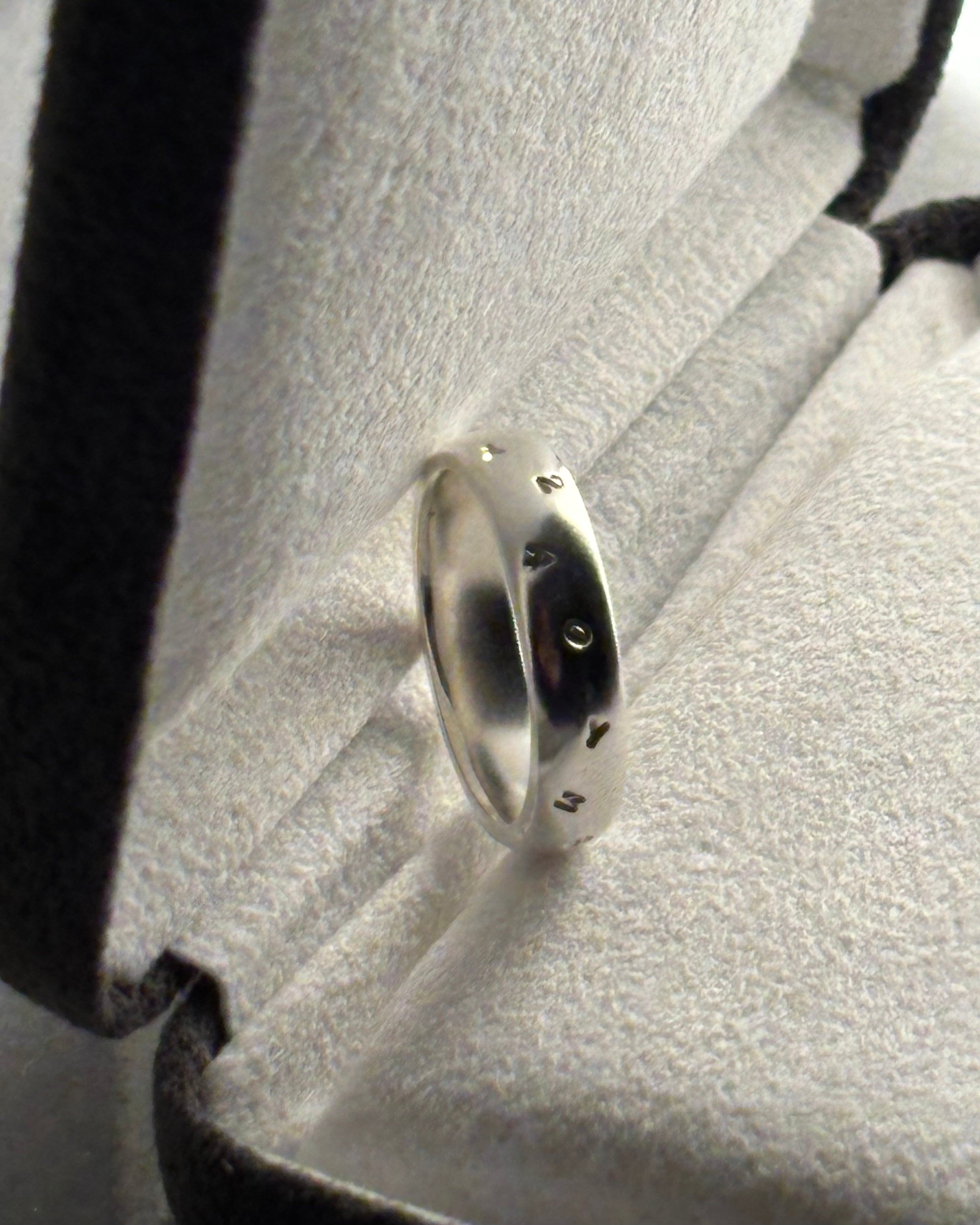 ・ご注文の際に備考欄へご希望サイズと入れたい言葉や英単語をご記載ください。文字数が多くなると文字と文字の間隔が狭くなります。画像のものでサイズが13号、文字数が14文字です。