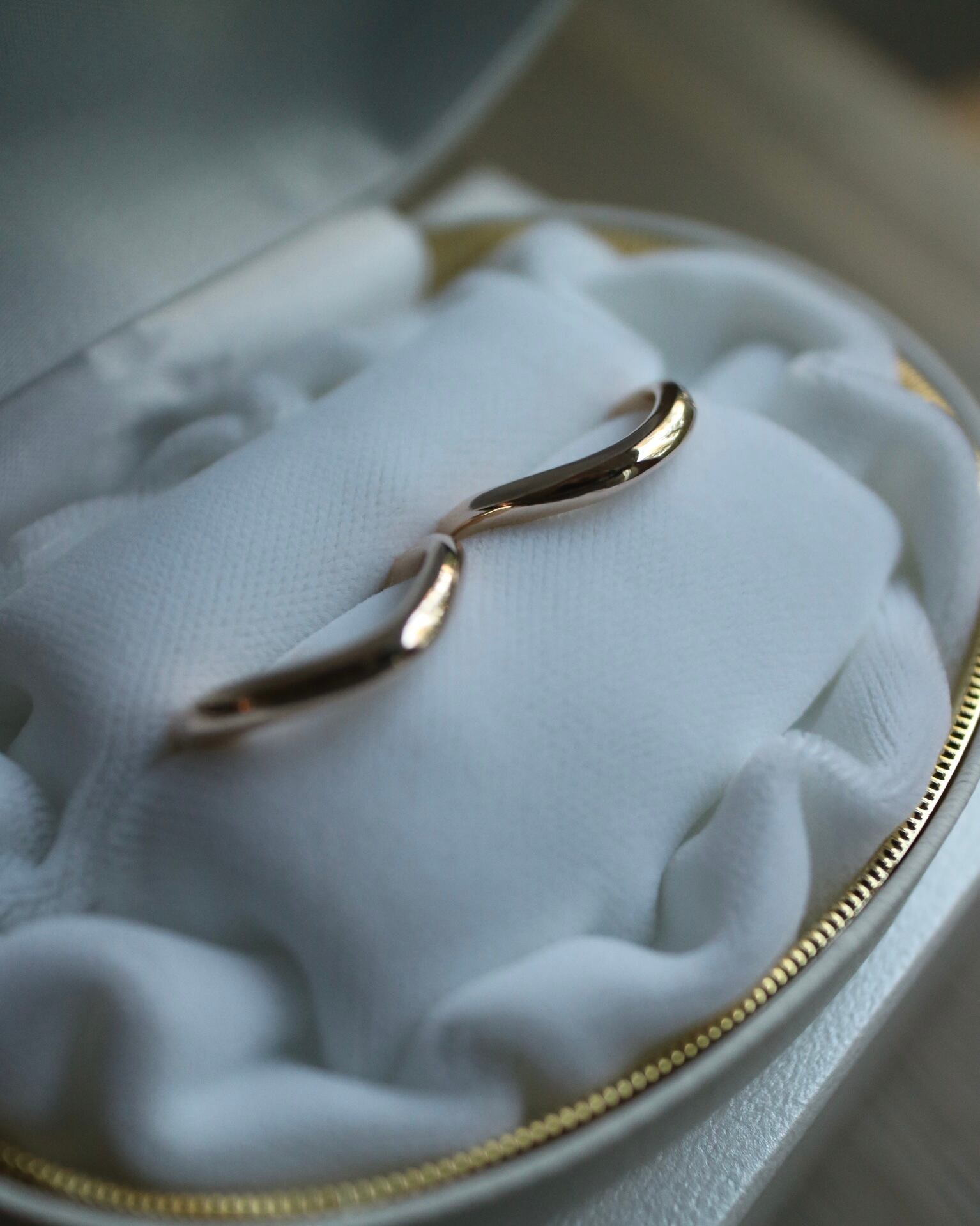 ウェーブや幅感をご相談させていただきながら、婚約指輪と重ね付けしてバランスの良い幅感で制作させていただきました。K10YGの色味がシルバーとも相性がよく、どんなジュエリーとも合わせやすいので素材で悩まれている方におすすめです。